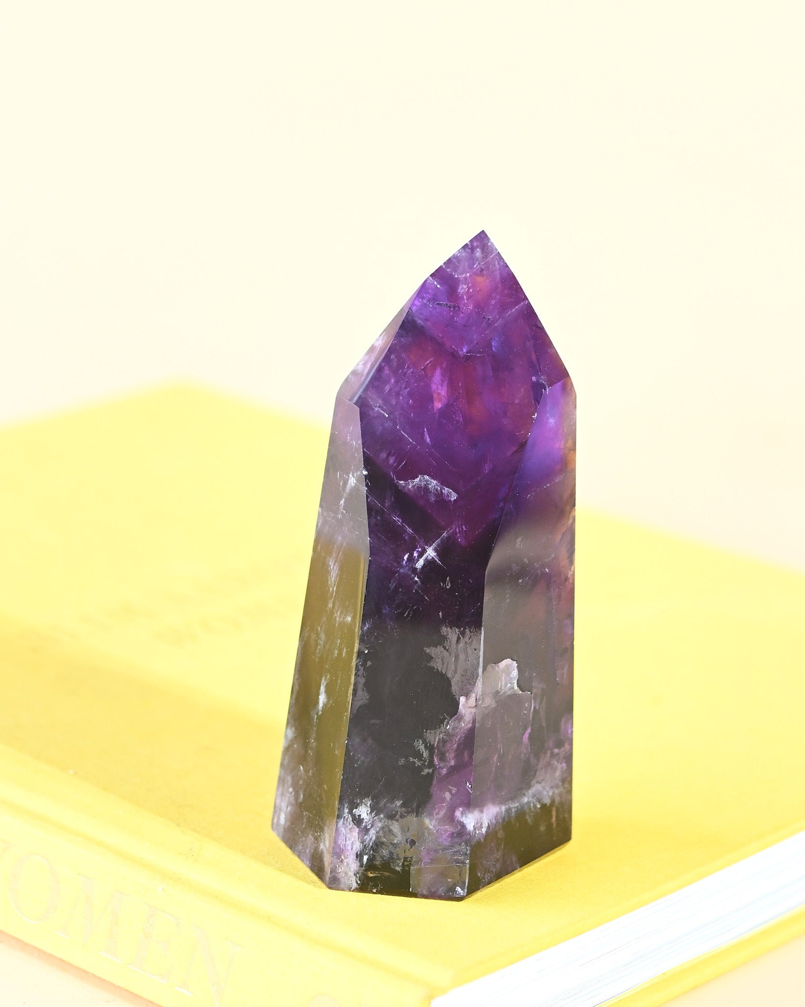 A vertical conduit of deep violet. An expertly faceted amethyst tower showcasing intense purple saturation and natural internal movement. The polished surfaces reveal a hidden world of crystalline veils and light-bending inclusions. The obelisk form is a classic of the collector’s library, offering height and architectural rigor to a grouping. Display where it can catch direct light to reveal its inner depths. Origin: Brazil. Energetic Association: Tranquility.