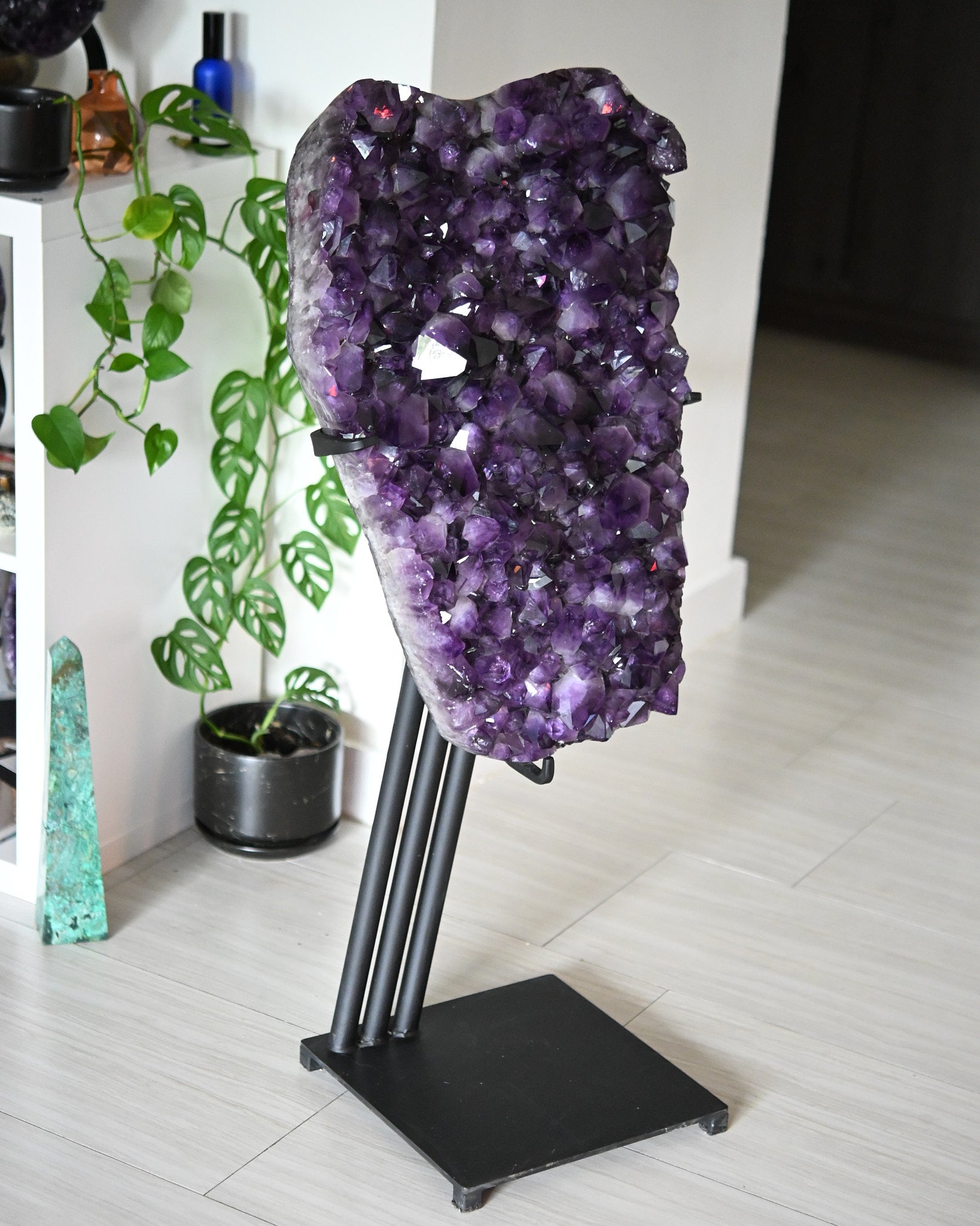 Sourced from a family-owned mine in Brazil, this is one of the most exceptional amethyst geodes I have brought in and I have been sourcing for a long time. The points are extraordinarily deep and chunky, packed edge to edge in that near-black violet that only this region produces, the kind of color that stops people mid-conversation. At 98 pounds and 37 inches tall on its custom matte black steel stand, this is a showstopper in every sense of the word. One of a kind.