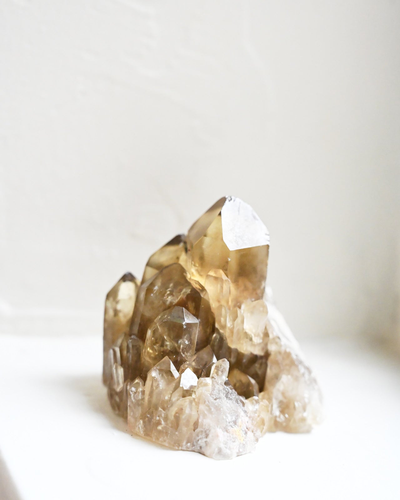 A compact Elestial Citrine cluster from Namibia with layered crystalline structure and soft champagne tones. Approximate size: 3 Γ 2 inches. Weight: 139.4 g (0.31 lb). One of a kind.