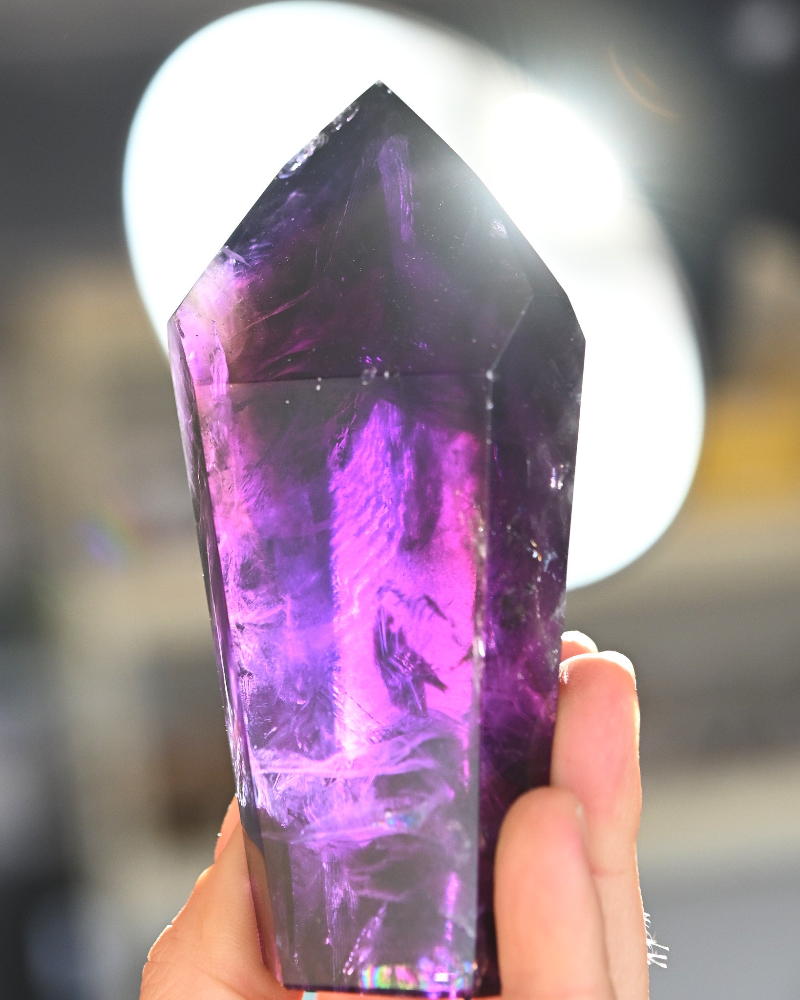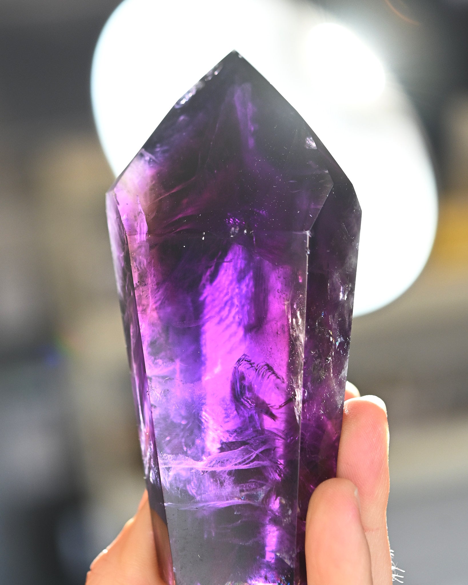 Material & Formation: High-grade amethyst polished into geometric tower with visible internal zoning.