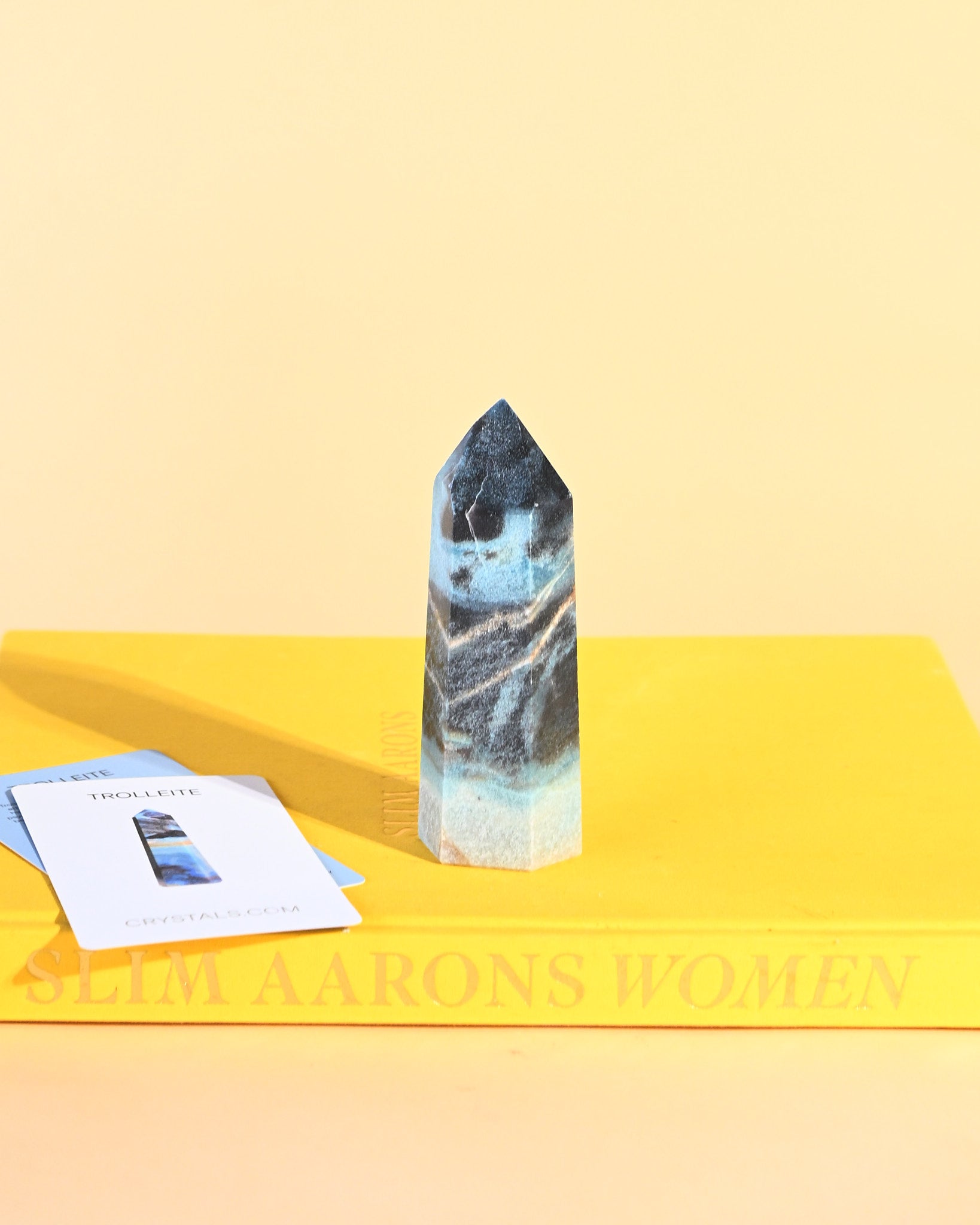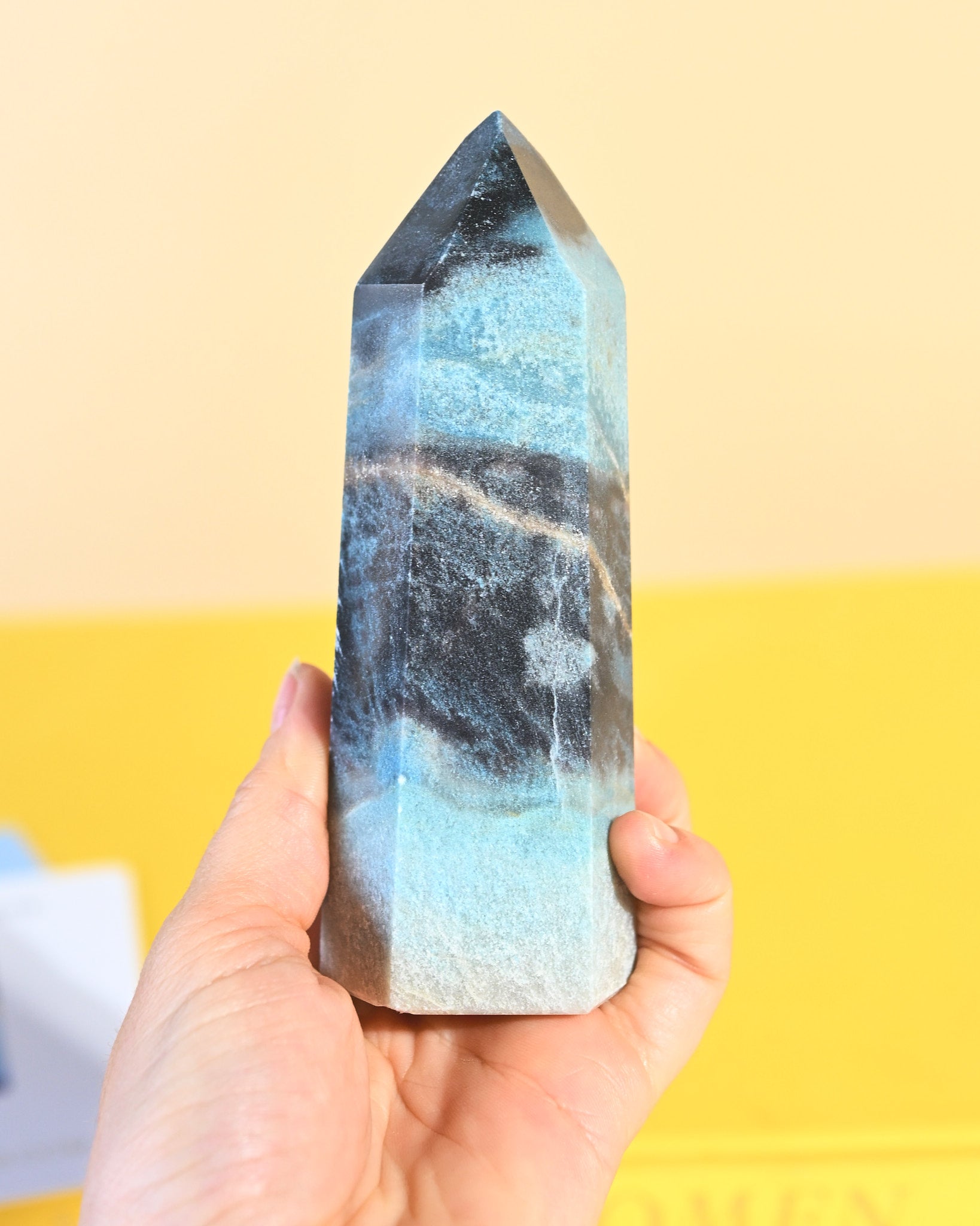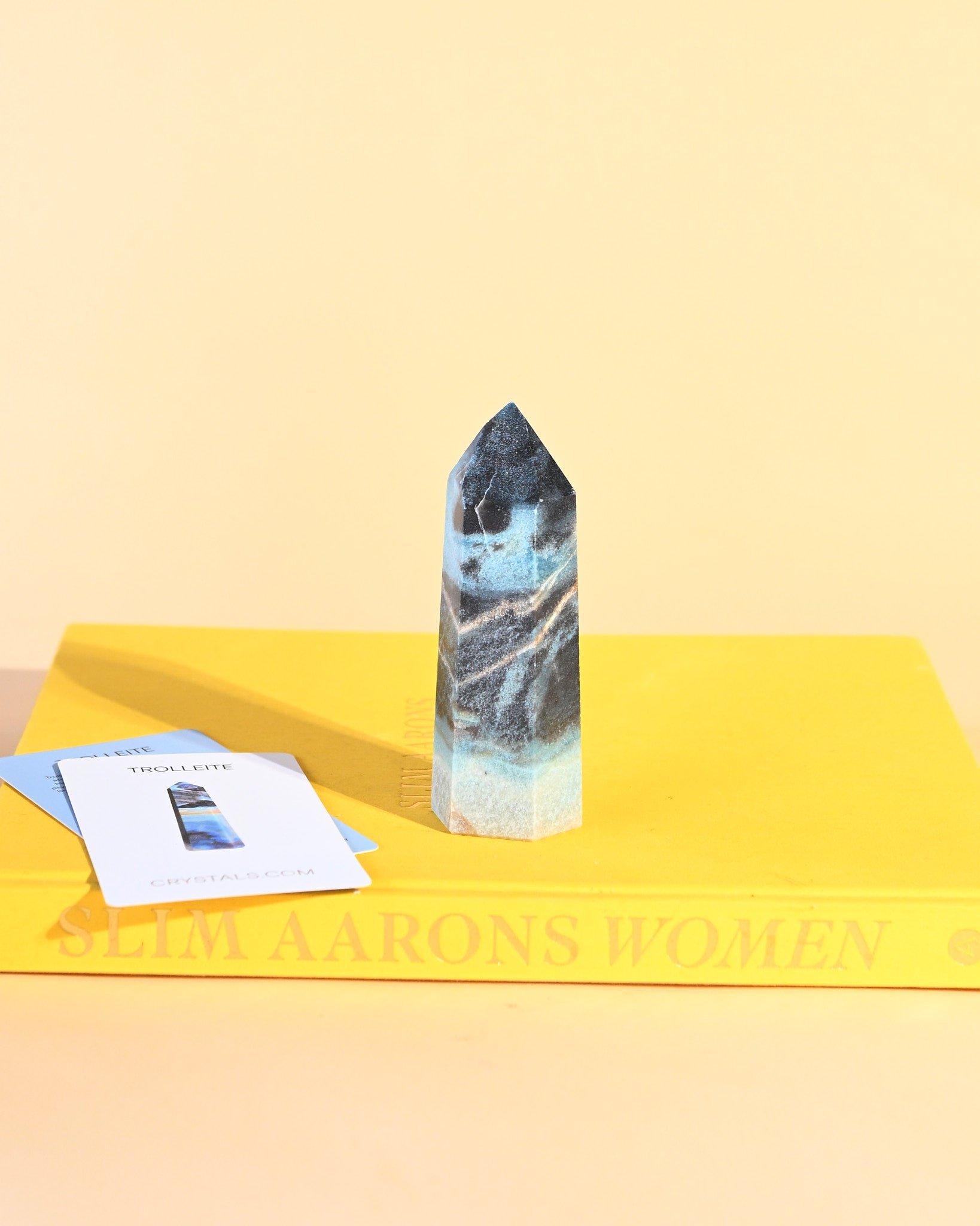 A polished trolleite tower in layered denim blue, indigo, and soft quartz-grey—banding that reads like weather moving across a horizon. The finish is satin-smooth with subtle mineral grain, keeping the piece modern and architectural rather than glossy.