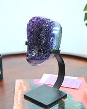 Enhance your space with this stunning Amethyst Crystal, beautifully displayed on a custom stand. This one-of-a-kind piece is a captivating natural formation and a powerful tool for spiritual growth and energy healing. The removable stand allows you to showcase it upright or lay it flat, giving you versatile display options. You will receive the exact amethyst crystal shown, ensuring its unique energy and form is exclusively yours.