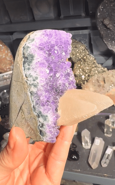 Amethyst geodes (deep violet quartz) are signature. You’ll also commonly see agate, chalcedony and clear quartz clusters from the same volcanic flows.