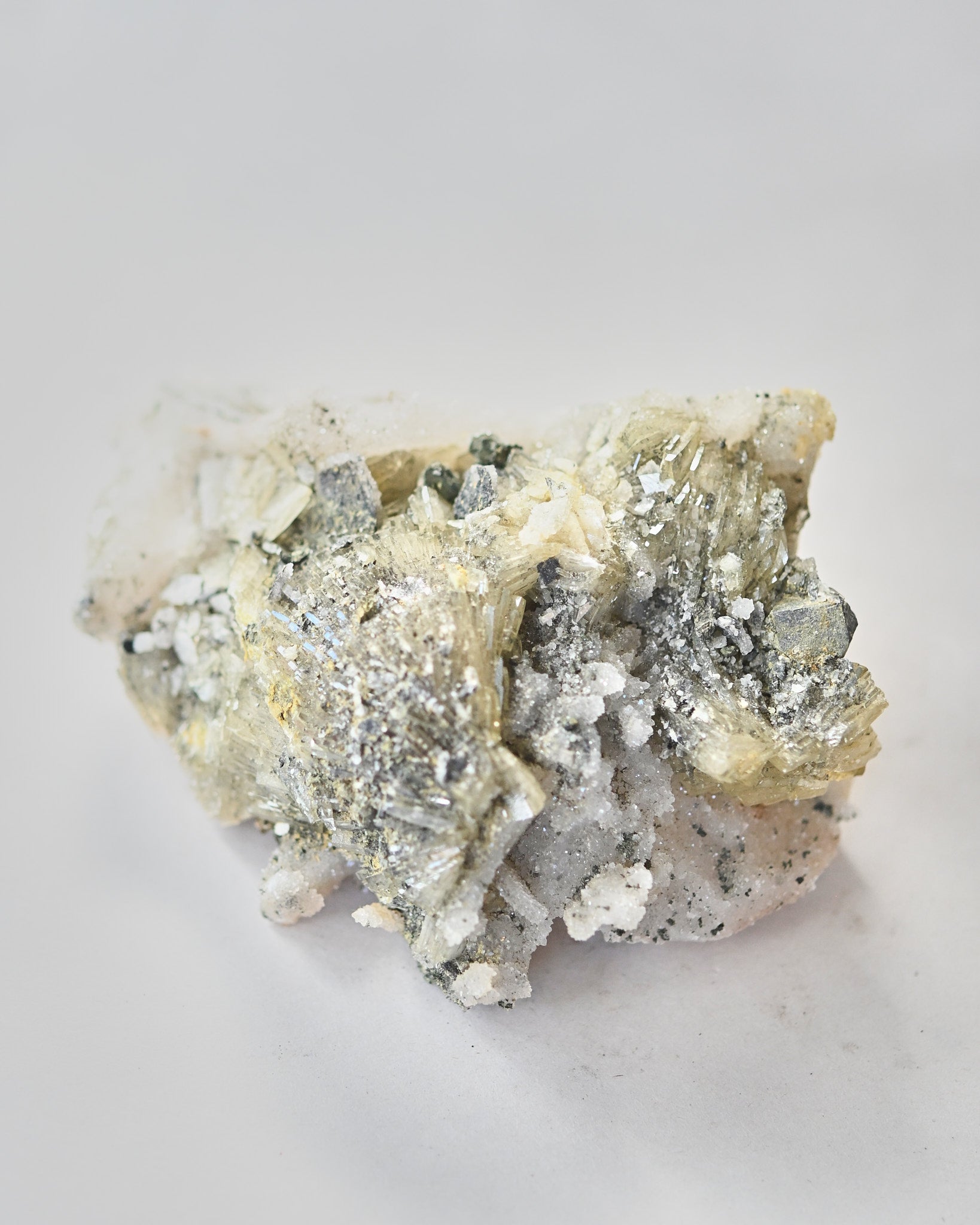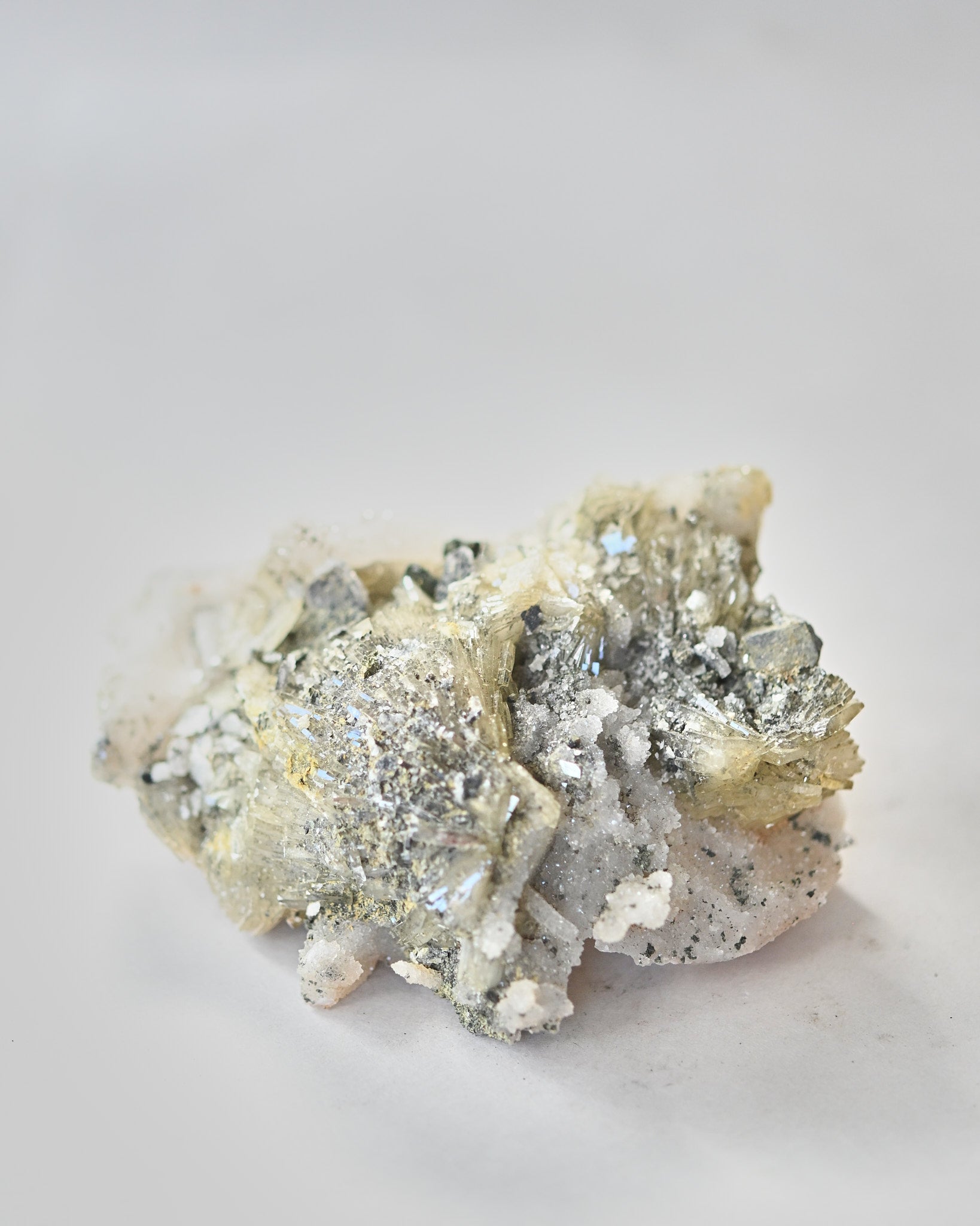A rare and visually striking specimen from Morocco, featuring golden, blade-like Barite crystals nestled alongside delicate Calcite formations on a sparkling matrix. The contrasting textures and tones create a natural sculpture that feels both earthy and luminous.