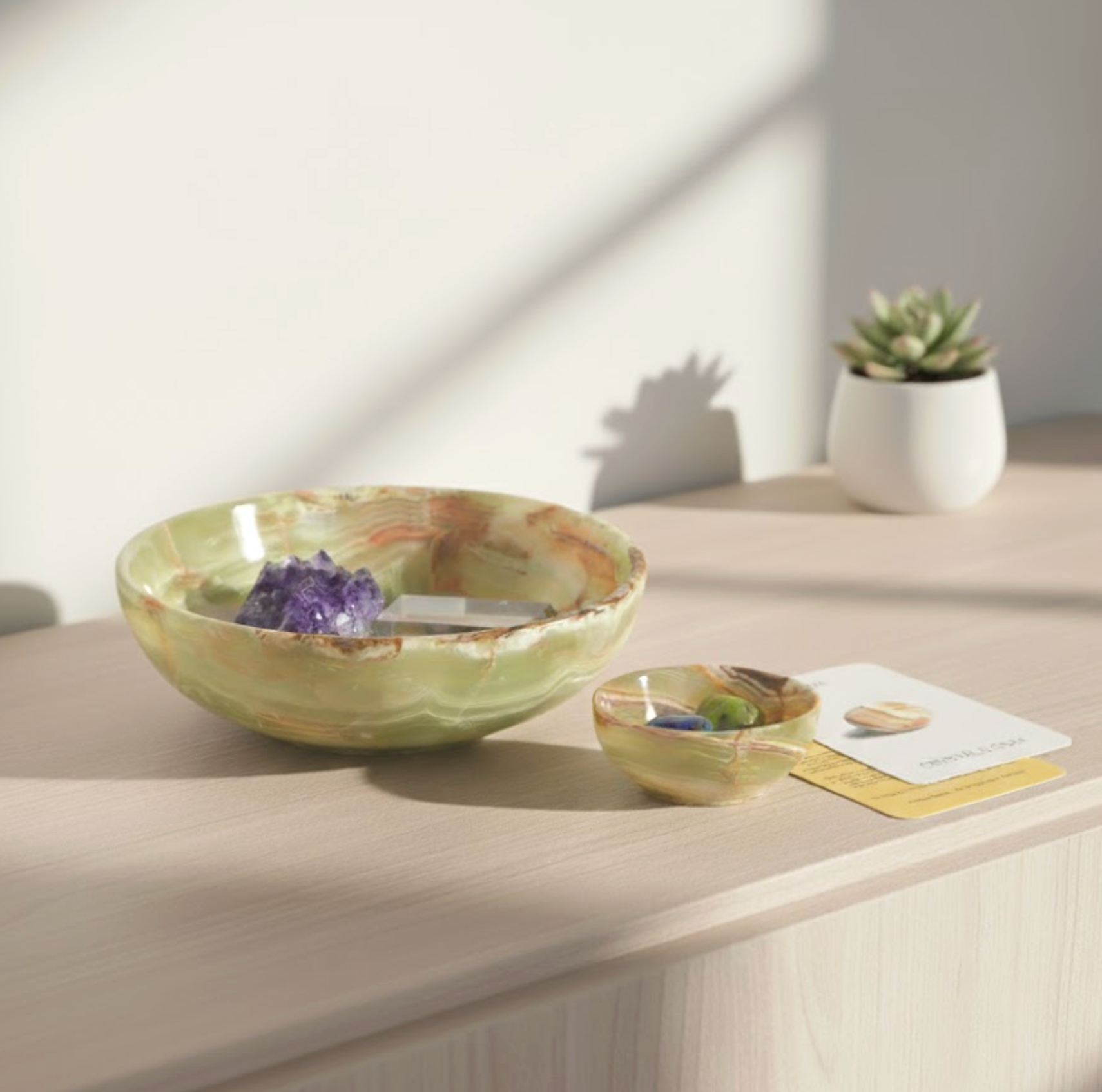 Each Onyx Crystal Bowl from Crystals.com is hand-carved and polished to highlight its natural bands and textures. Because it’s formed in nature, no two bowls are alike — each is a one-of-a-kind piece that carries grounding energy and quiet elegance.