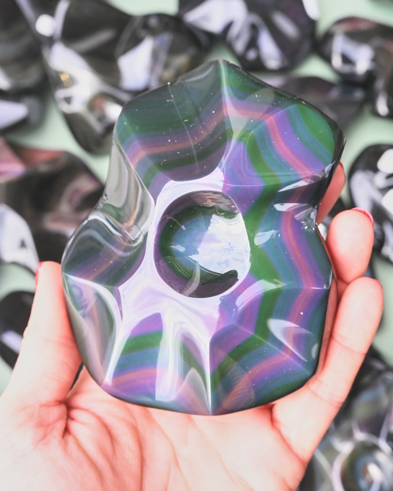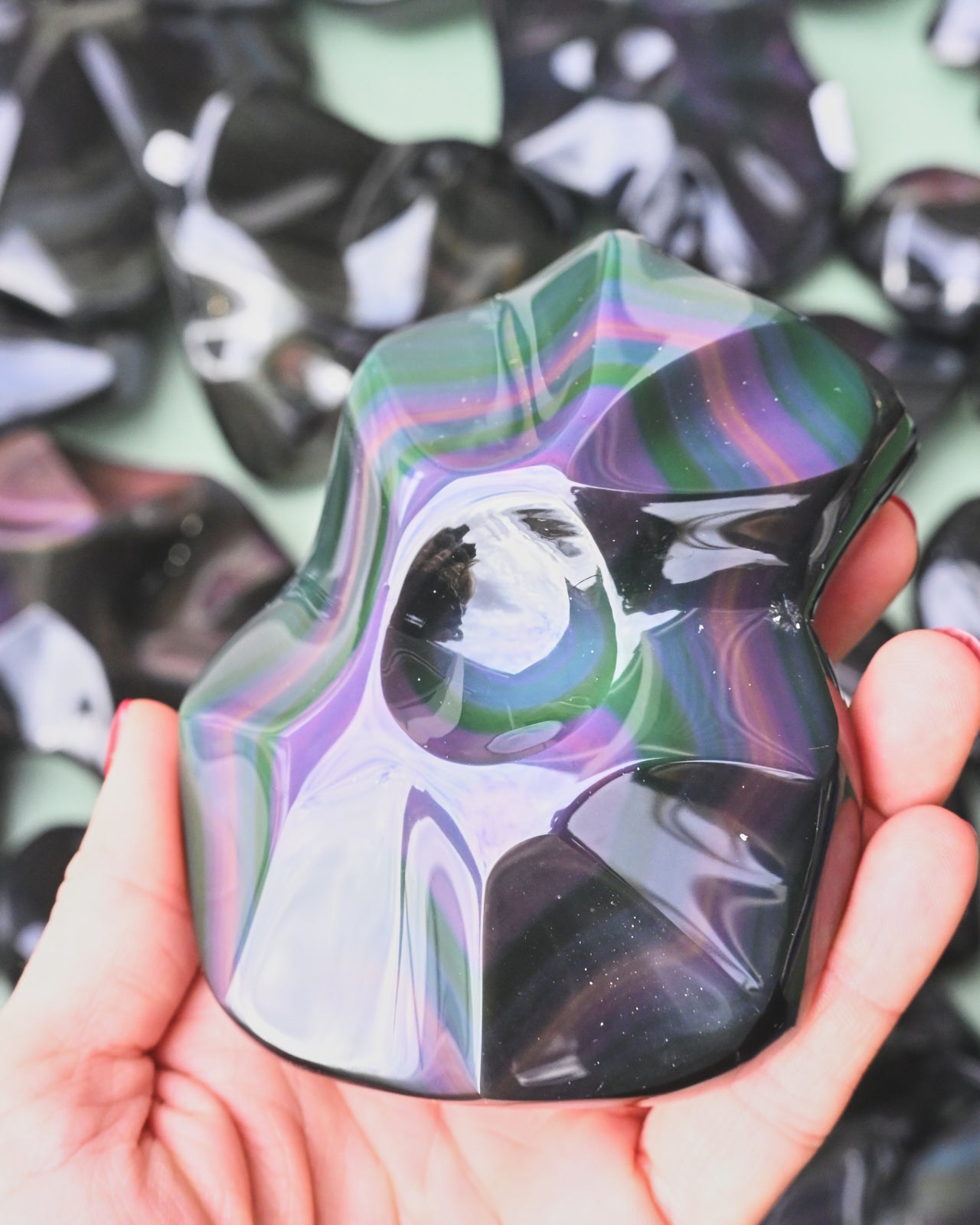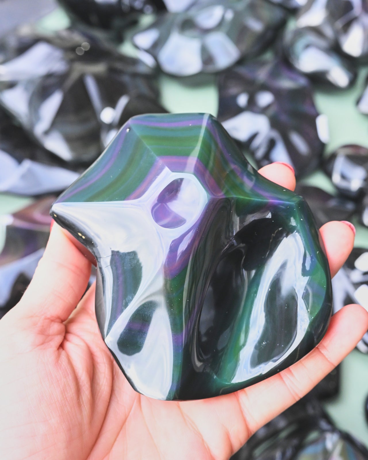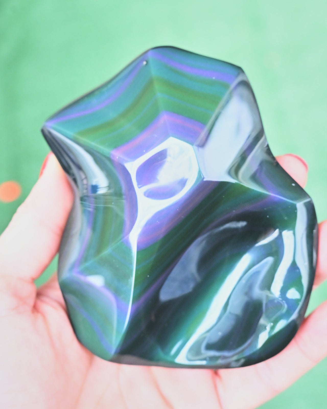 A beautiful purple and green rainbow obsidian freeform displaying soft iridescent flashes beneath a deep black surface. Polished to a mirror finish, this piece offers movement, depth, and a refined sculptural silhouette ideal for modern interiors.