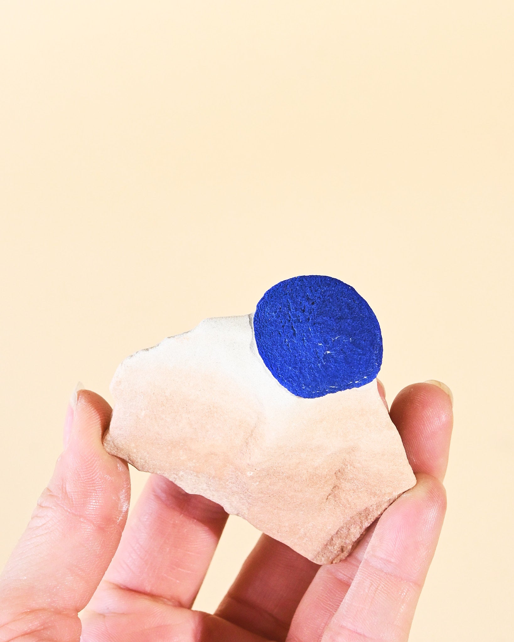 This piece displays two fully developed azurite “suns,” each formed through tightly radiating crystal growth that creates a flattened, disc-like structure — a formation rarely found outside this specific mine. The surfaces are richly saturated in deep cobalt blue, with a fine granular crystalline texture that produces subtle sparkle under direct light.