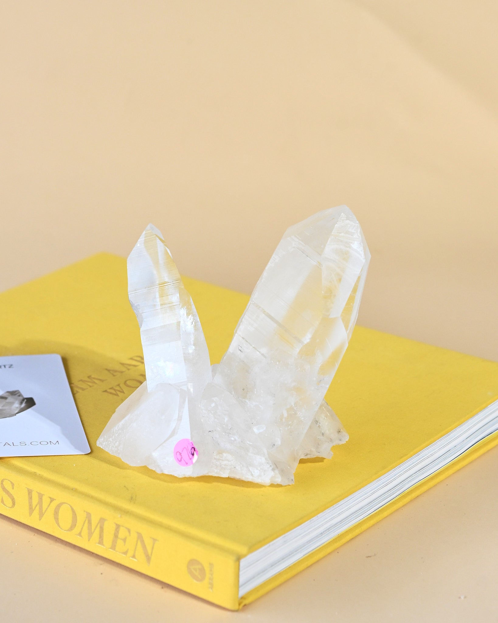 A striking Clear Quartz crystal cluster from Brazil featuring a beautifully balanced multi-point formation with a tall primary termination rising above smaller companion crystals. This one-of-a-kind quartz specimen displays exceptional clarity and luminous internal structure, with subtle natural inclusions that highlight the crystal’s organic growth patterns.