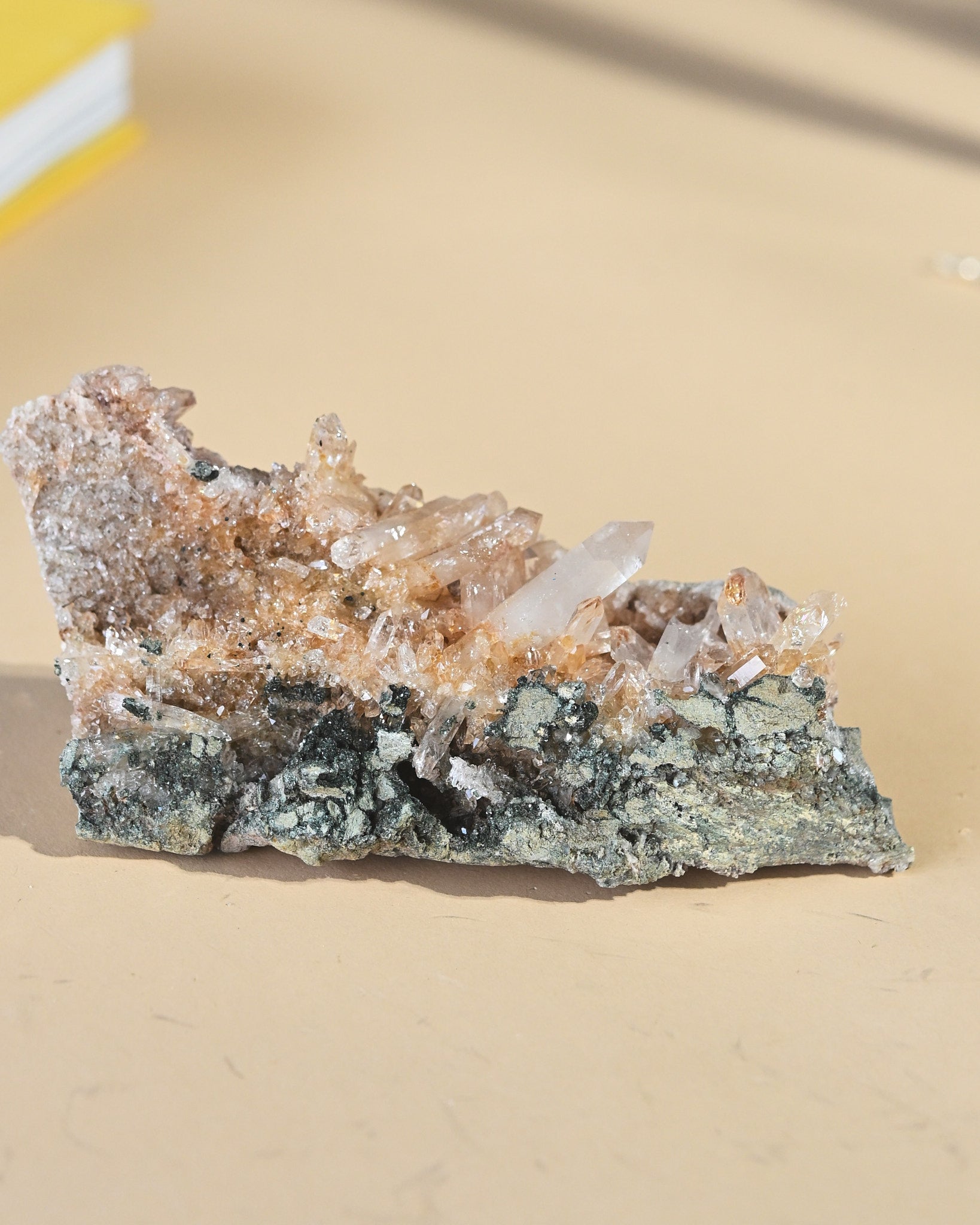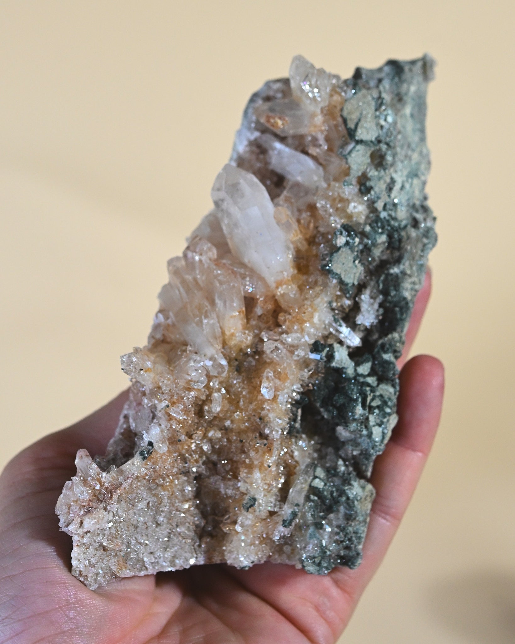 Delicate quartz points rise from a sparkling crystalline bed, creating a sculptural mineral composition that feels both wild and refined. The soft honey and champagne tones of the quartz contrast elegantly with the deep green chlorite matrix, producing a natural palette that works beautifully as crystal home decor or a collector’s mineral specimen.