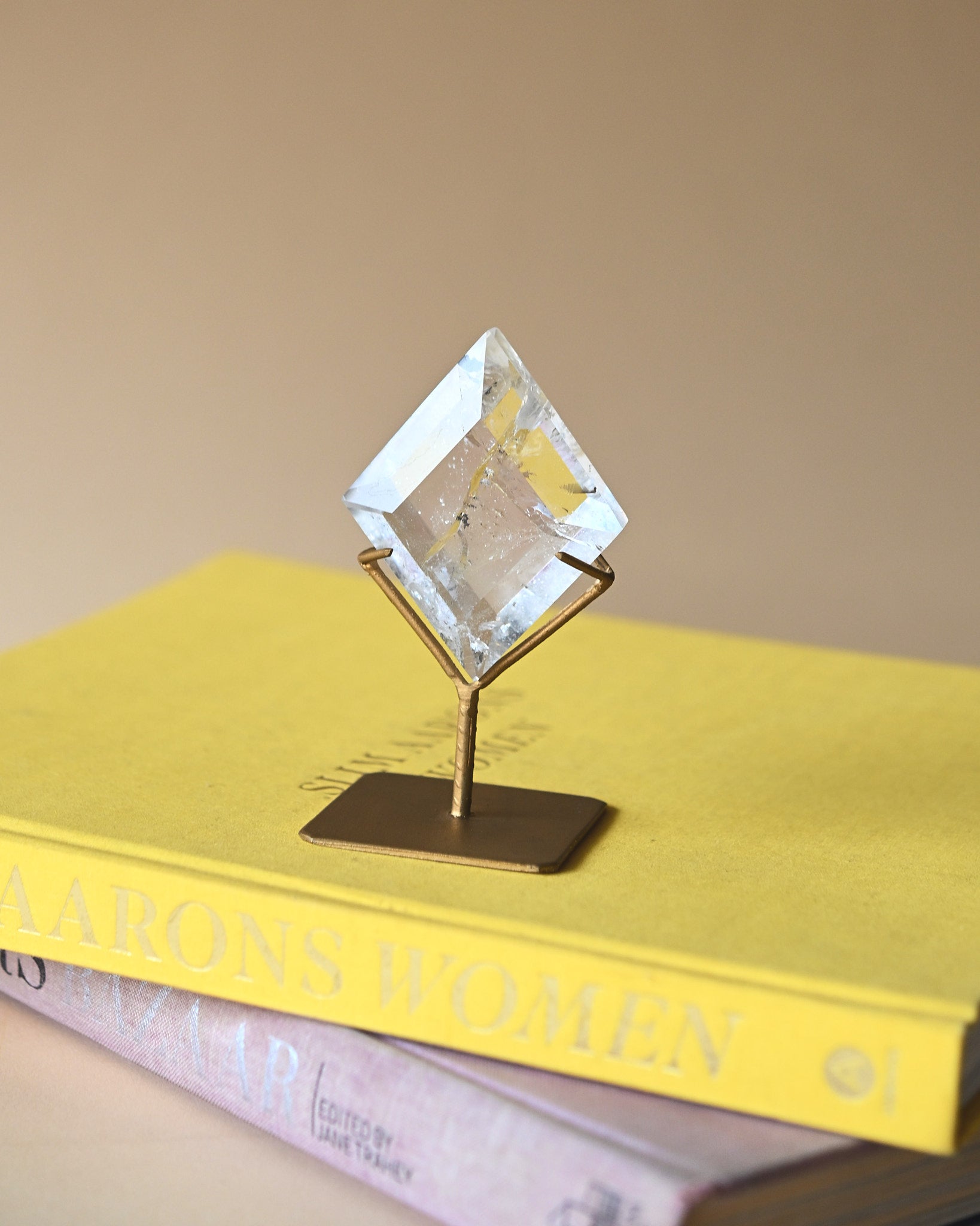 A precision-cut clear quartz “diamond” mounted on a minimal brass display stand.