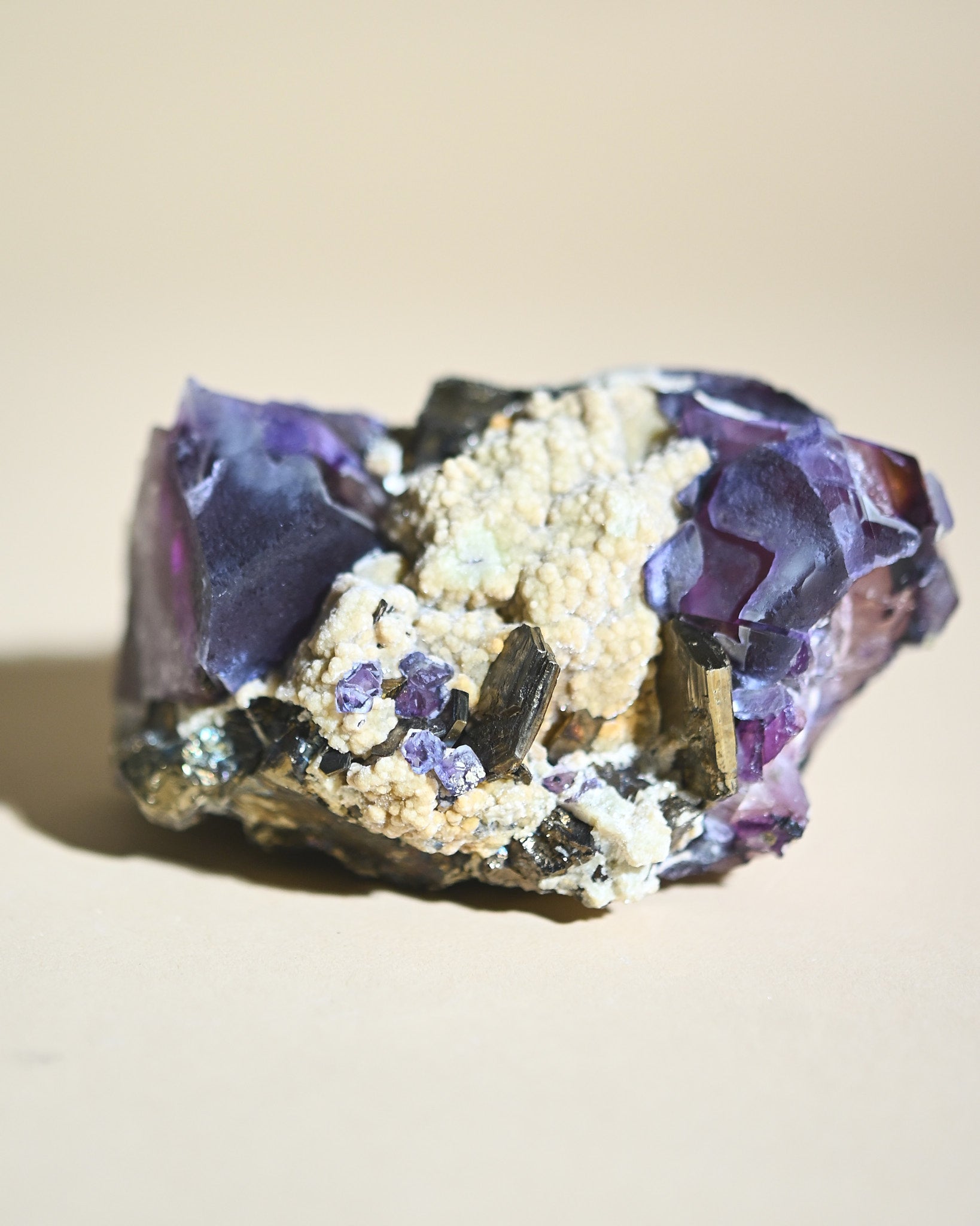 Multiple fluorite cubes display rich purple zoning with translucent interiors and visible internal structure. The crystals are embedded in a contrasting cream calcite matrix, creating strong visual separation between the fluorite and associated sulfides. Metallic pyrrhotite crystals are distributed across the specimen, adding structural interest and mineralogical complexity.