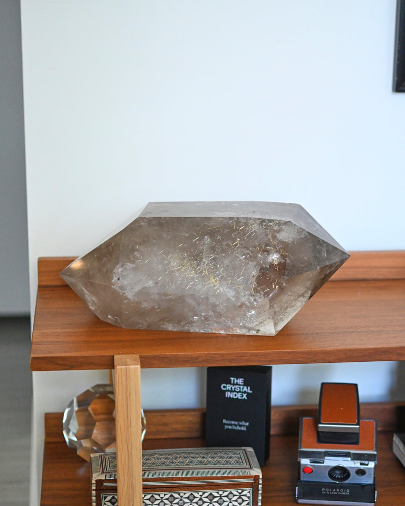 From Brazil, the Golden Rutile Smoky Quartz is a museum-quality double-terminated point weighing an awe-inspiring 29 pounds. Its golden rutile inclusions form intricate filaments suspended within translucent smoky quartz, a phenomenon revered for channeling light and intention. The dual terminations allow balanced energy flow in both directions—an embodiment of harmony, manifestation, and transformation.