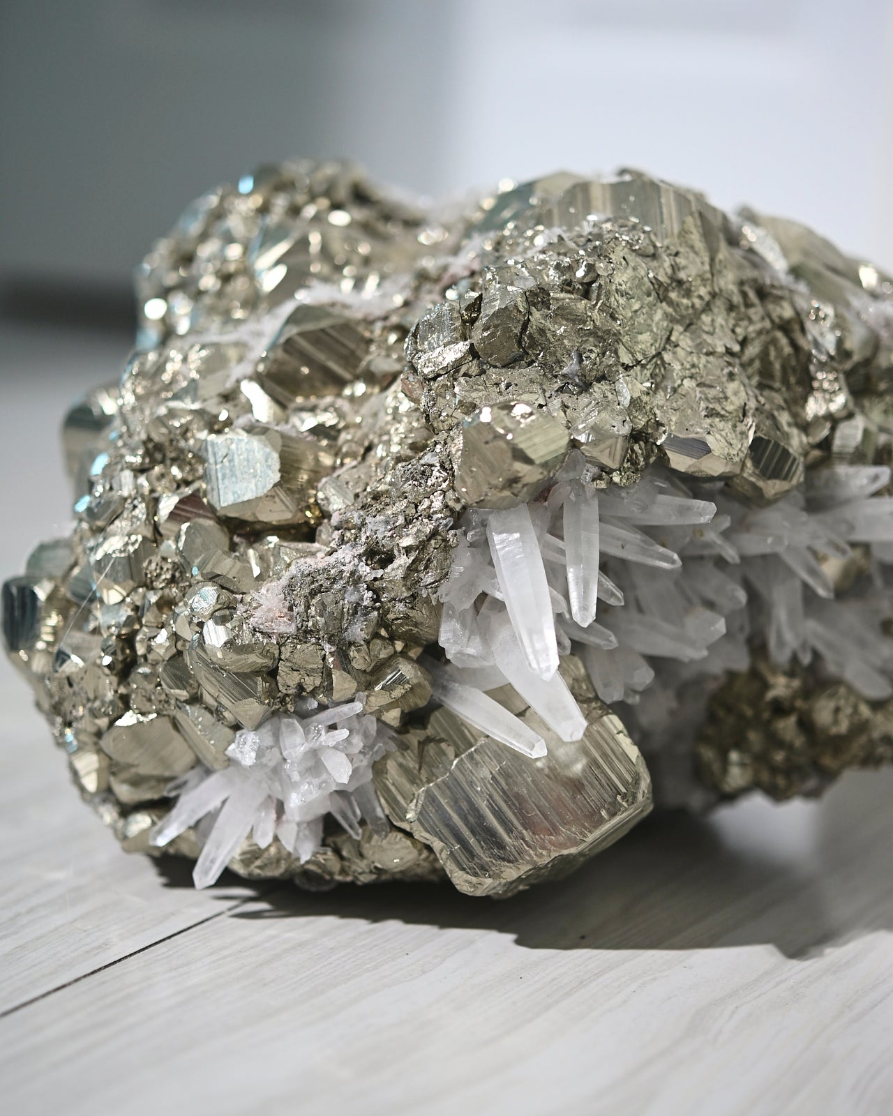 From Peru, the Quartz with Pyrite exudes earthy elegance: radiant quartz points intertwined with metallic pyrite, balancing clarity and abundance. Pyrite’s golden shimmer symbolizes prosperity and protection, while quartz amplifies energy and intention. Together, they create a grounding yet luminous presence—ideal for a meditative corner or statement console.