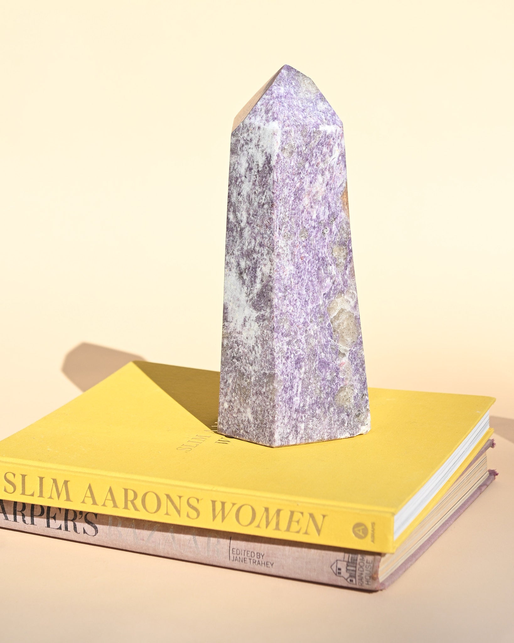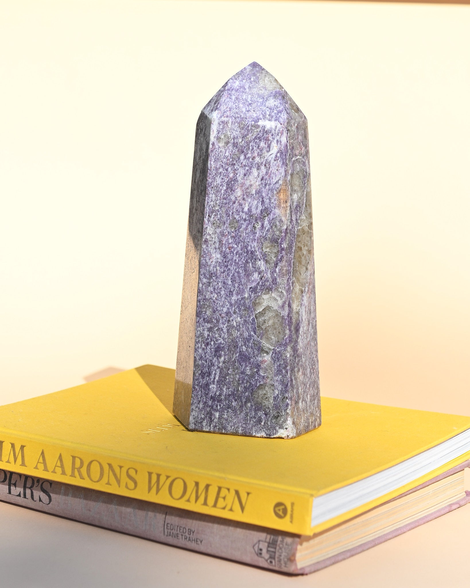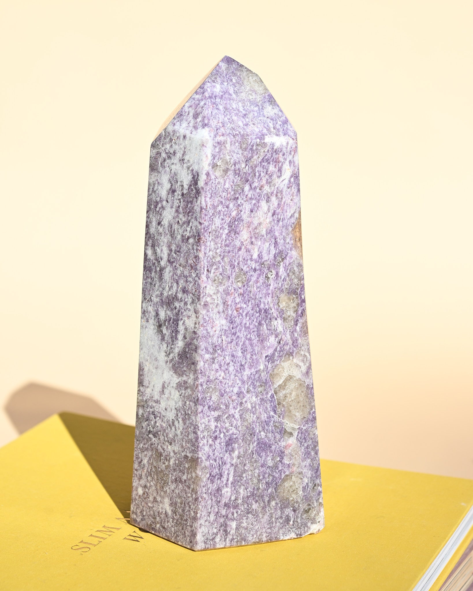 Natural lepidolite (mica-rich) tower with lilac-to-silver variation and visible mineral texture.