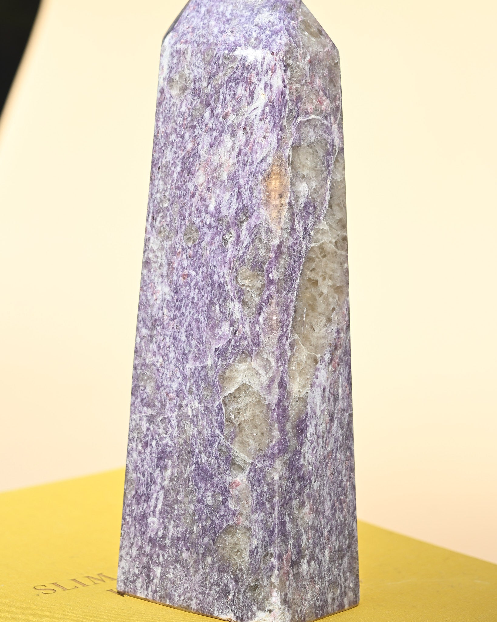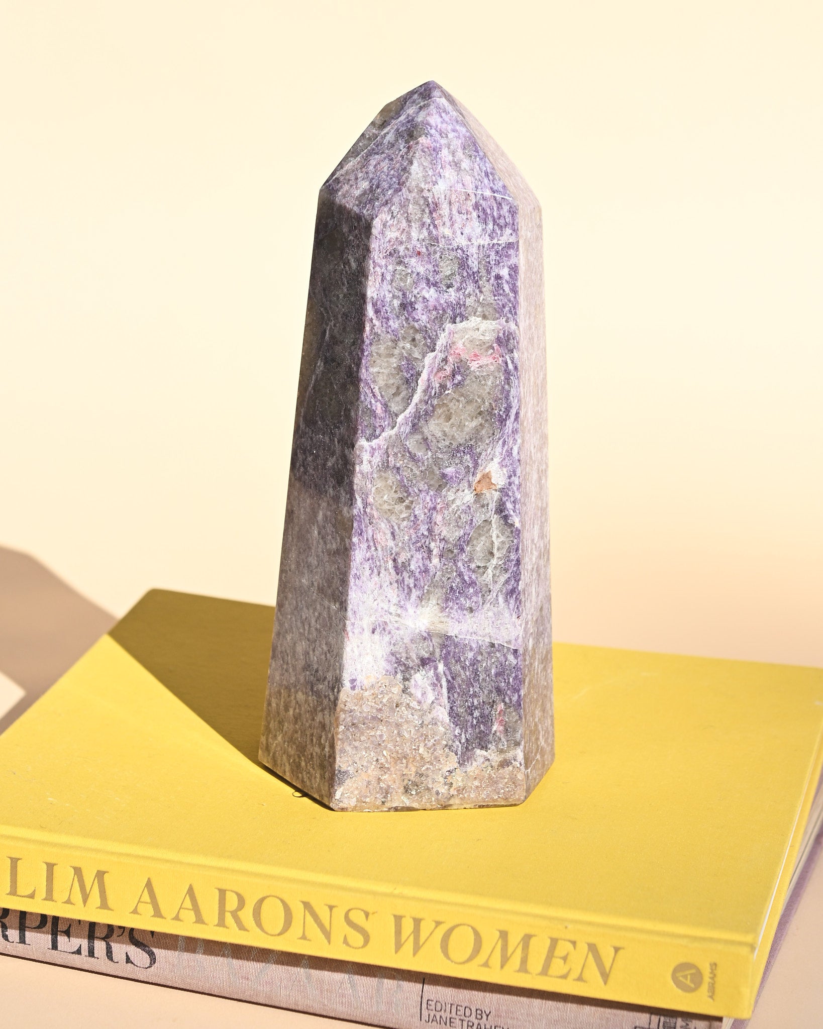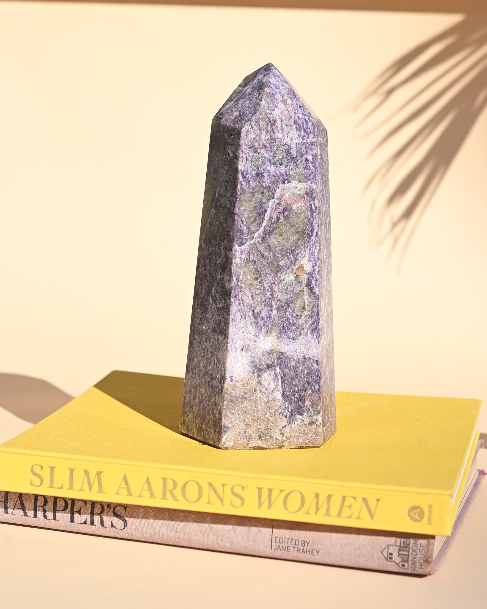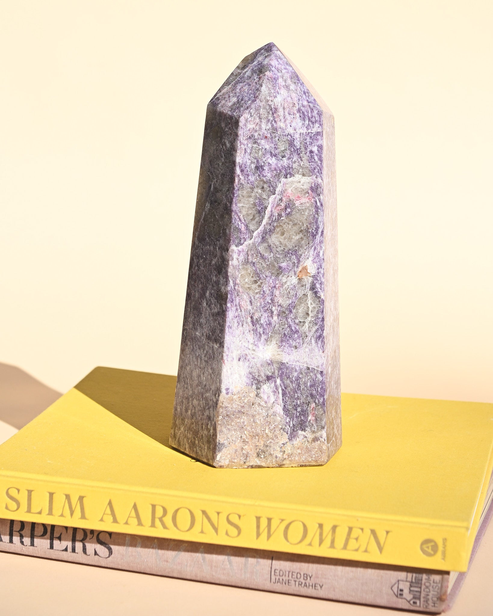 Natural lepidolite (mica-rich) tower with lilac-to-silver variation and visible mineral texture.