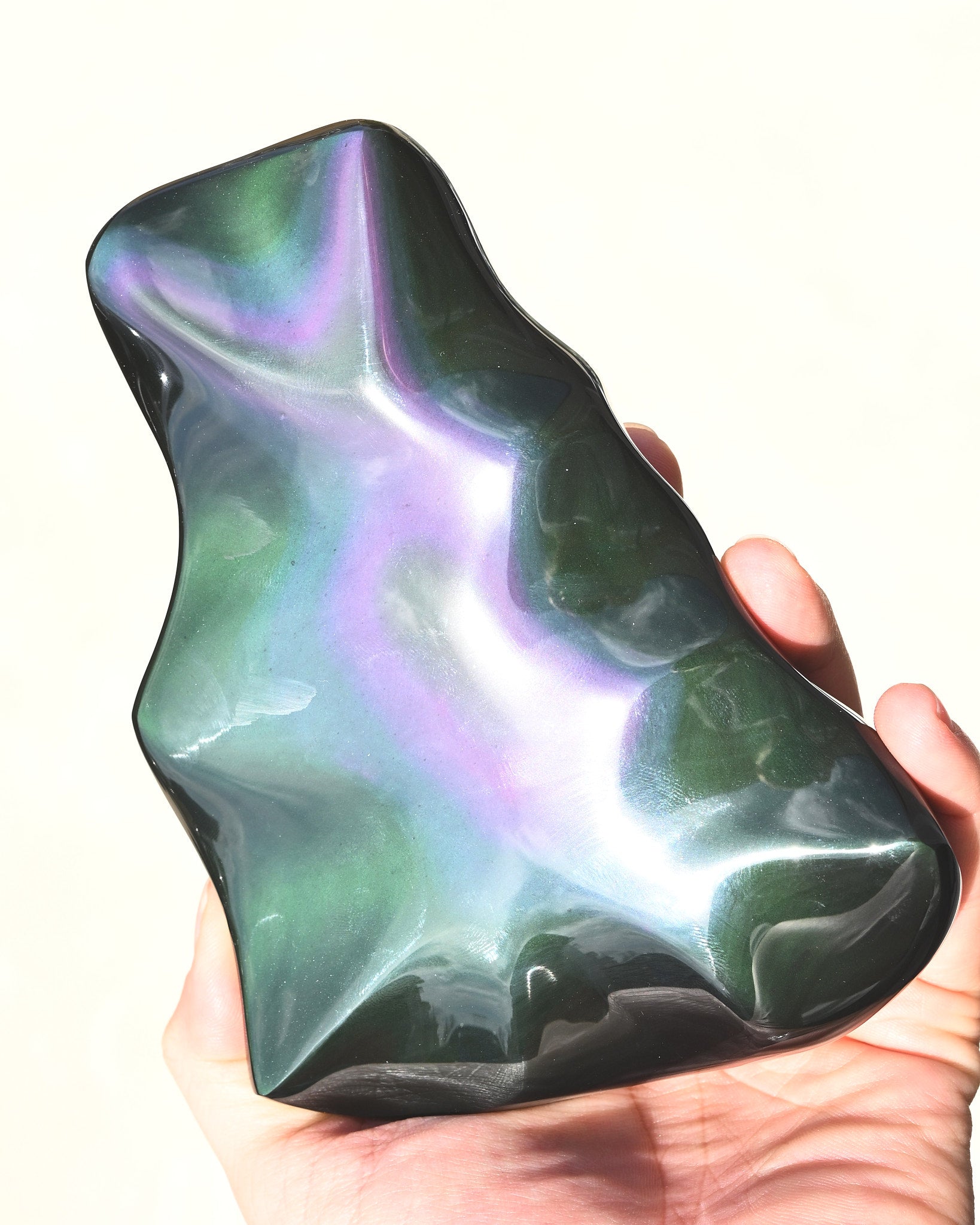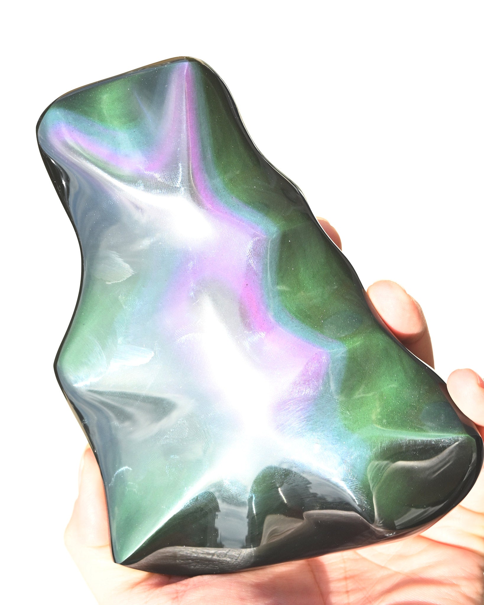 When angled to light, vivid bands of green, blue, and soft violet radiate across the surface — natural iridescence created within the volcanic glass. The polish is glass-smooth, allowing the flash to move fluidly across the carved hearts.