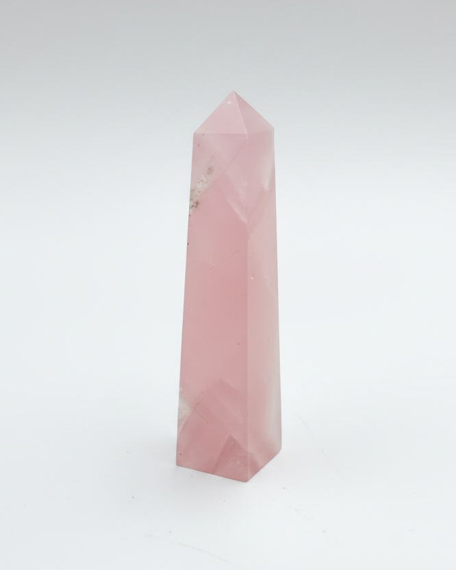 Soft pink rose quartz carved into a refined obelisk form—an object of intention, balance, and quiet beauty.