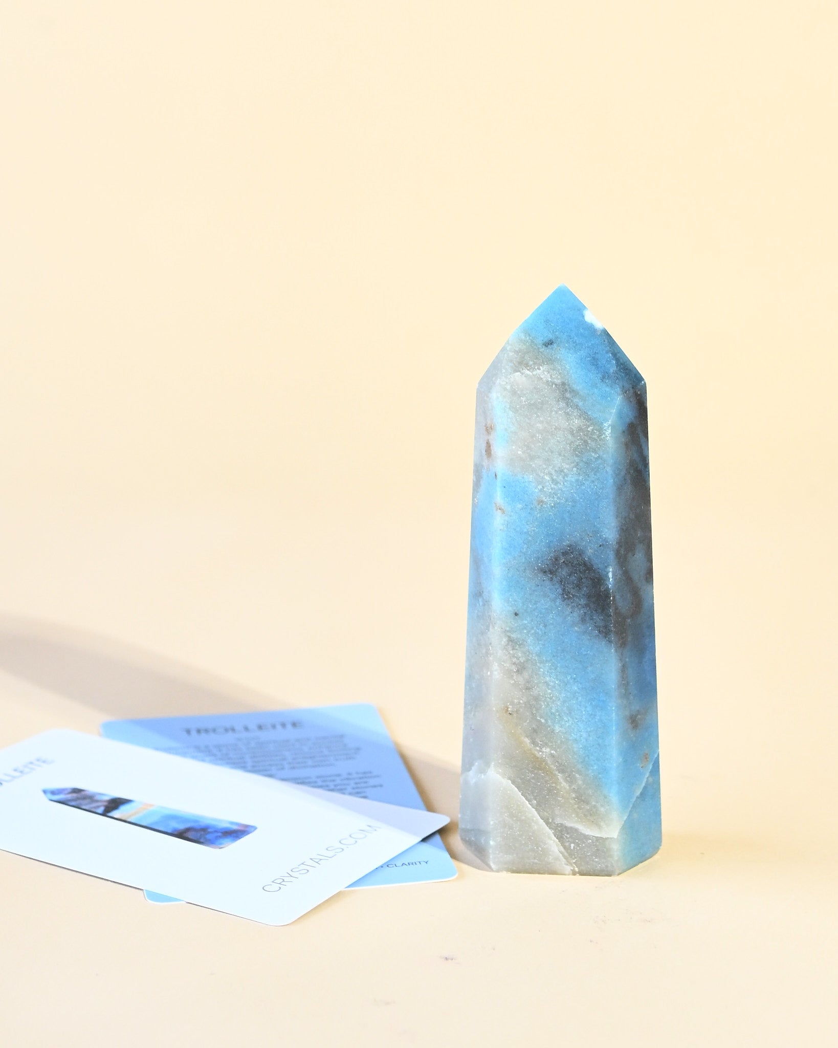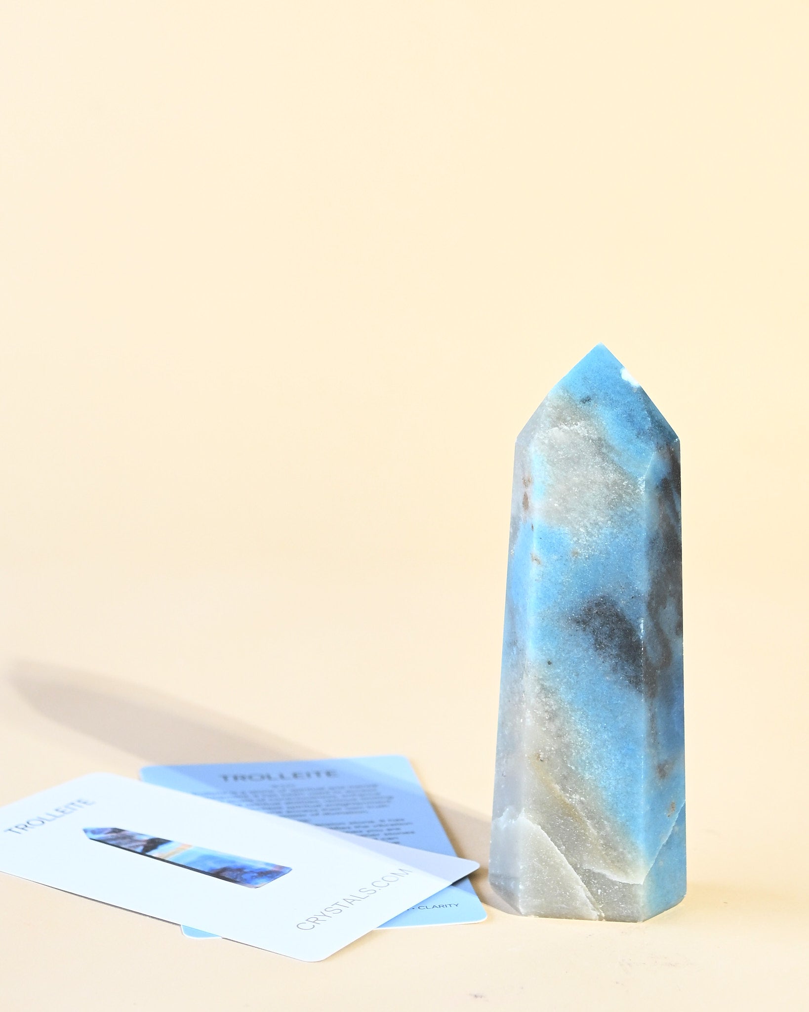 A polished trolleite tower in layered denim blue, indigo, and soft quartz-grey—banding that reads like weather moving across a horizon. The finish is satin-smooth with subtle mineral grain, keeping the piece modern and architectural rather than glossy.