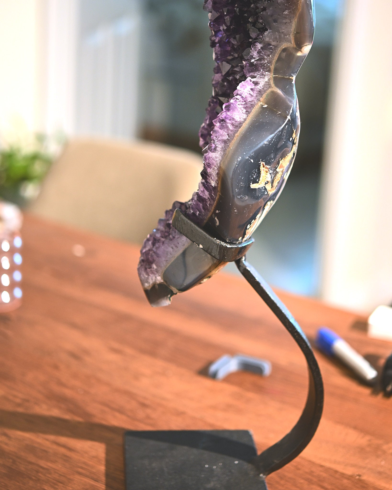 Amethyst is long revered for its protective and calming qualities. It is often associated with clearing stagnant or negative energy, supporting emotional balance, and encouraging clarity of mind. Many collectors and designers value amethyst not only for its metaphysical associations, but also for its ability to anchor a space with quiet strength and natural beauty.